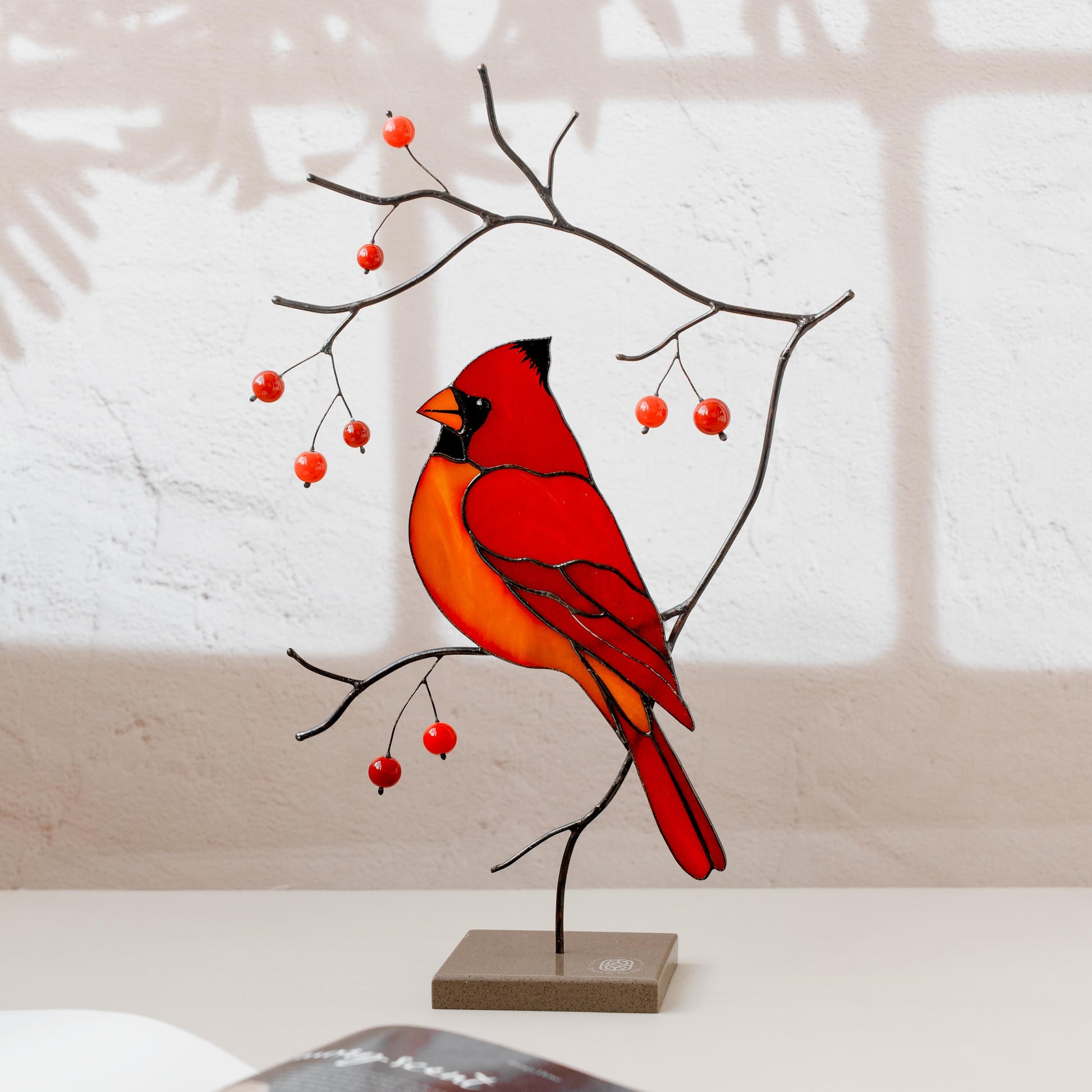 Add heartfelt beauty to your home with this handcrafted stained glass red cardinal perched on a branch with ceramic berries. Standing on a faux stone base, this freestanding decor piece symbolizes love, remembrance, and spiritual connection, making it a meaningful accent for any table, mantle, or sacred corner.